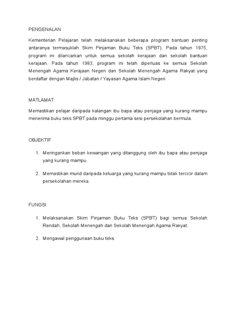 Dapatkan borang permohonan dan sediakan dokumen sokongan yang diperlukan. Skim Pinjaman Buku Teks SPBT telah diperkenalkan sejak tahun 1975 kepada semua sekolah kerajaan dan bantuan kerajaan. Surat Pekeliling Kewangan Bil 1 Tahun 2021 Pengurusan Kewangan bagi Peruntukan Bantuan Persekolahan Umum KPM pdf 1155 MB 2932 muat turun Popular.